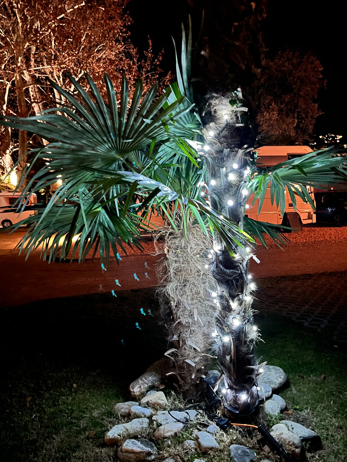 Auch der ganze Campingplatz leuchtet im Lichterzauber über die Weihnachtstage, der später beginnt, als andere Jahre. Den Weihnachtstag selber feiern wir mit Heidi und Erwin. Wir haben zuhause den Braten mit dem Gemüse vorgekocht, ihn tranchiert, anschliessend vakuumiert und tiefgefroren, weil so etwas ausgebreitetes nur mit grossen Umständen im Camper direkt zubereitet werden kann. Vom Dessert ist die Autorin so begeistert, dass sie automatisch davon ausgeht, dass jeder das ist. Selbstgemachte Glacé soll es sein, abgefüllt in Formen, aus denen man es zum Verzehren wie Eis am Stiel herausziehen kann. Grossartig nicht. Als Kind hatten wir auch selbstgemachtes Speise-Eis. Doch Mami füllte das einfach in die Eisschale des Gefrierfachs und schnitt es zum Verteilen in der Form in Stücke. Da ist doch so ein Eis am Stiel ein Riesenfortschritt. Denkt die Autorin. Bis Erwin meint, das hättenn sie doch als Kind immer vorgesetzt bekommen von ihrer Stiefmutter, weil sie kein Eis kaufen wollte. Hahaha. Da ist die Gastgeberin wohl ins beste Fettnäpfchen getreten. Nur mit umgekehrten Vorzeichen: Kaufen kann jeder, selber machen ist in.